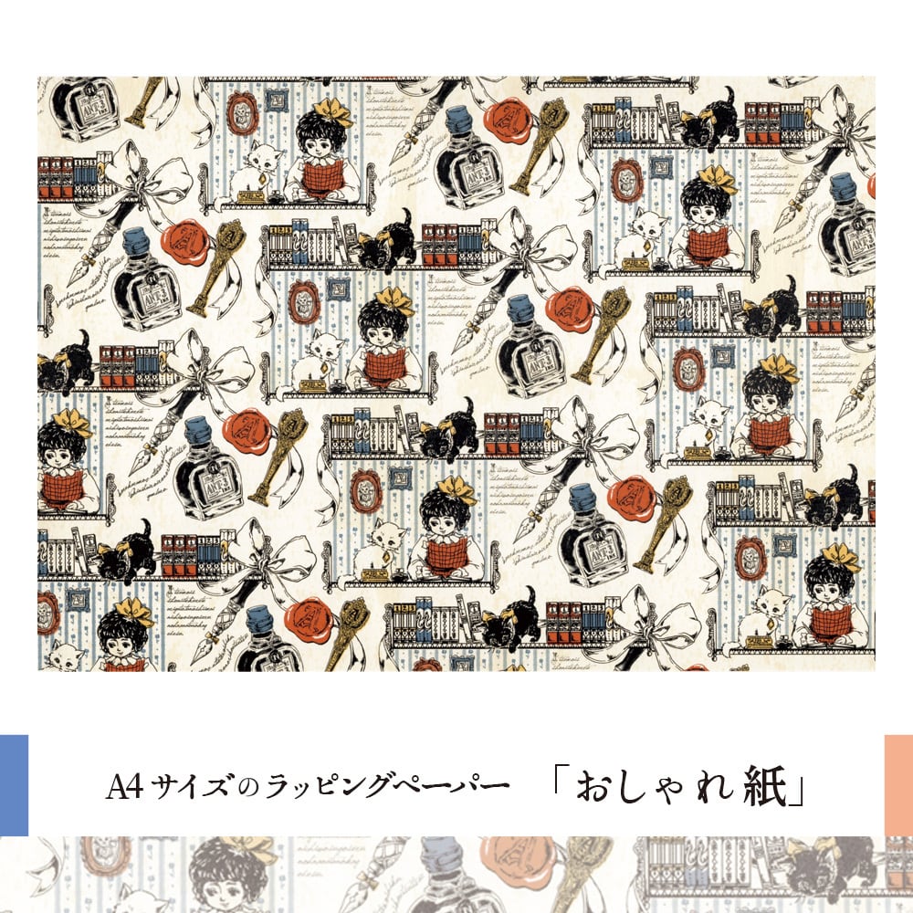 レトロな文具に囲まれた小さな書斎がテーマの包装紙。