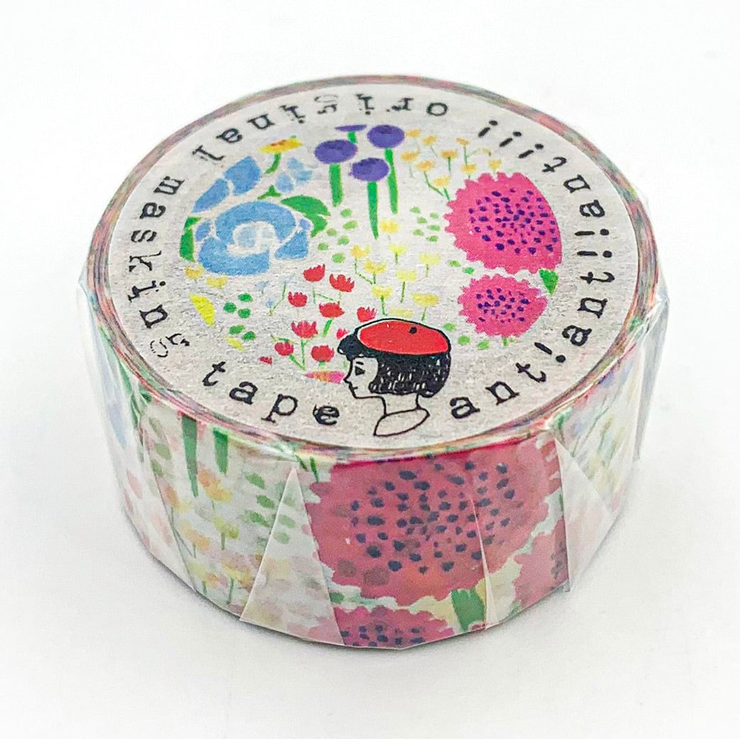 紙モノ作家『ant!ant!!ant!!!』のオリジナルイラストです。カラフルなお花がいっぱいなマスキングテープ。ラッピングに最適