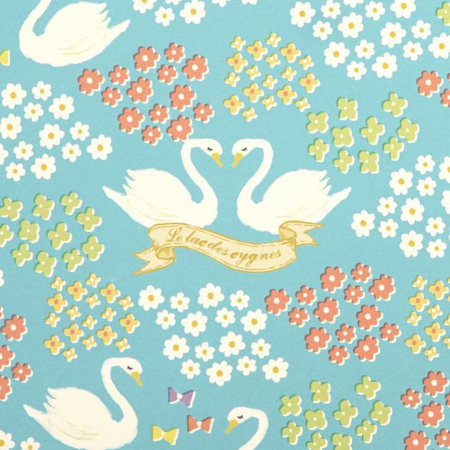 紙モノ作家『ant!ant!!ant!!!』のオリジナルイラストを使った、お花の浮かぶ水面とかわいいスワンの包装紙。
