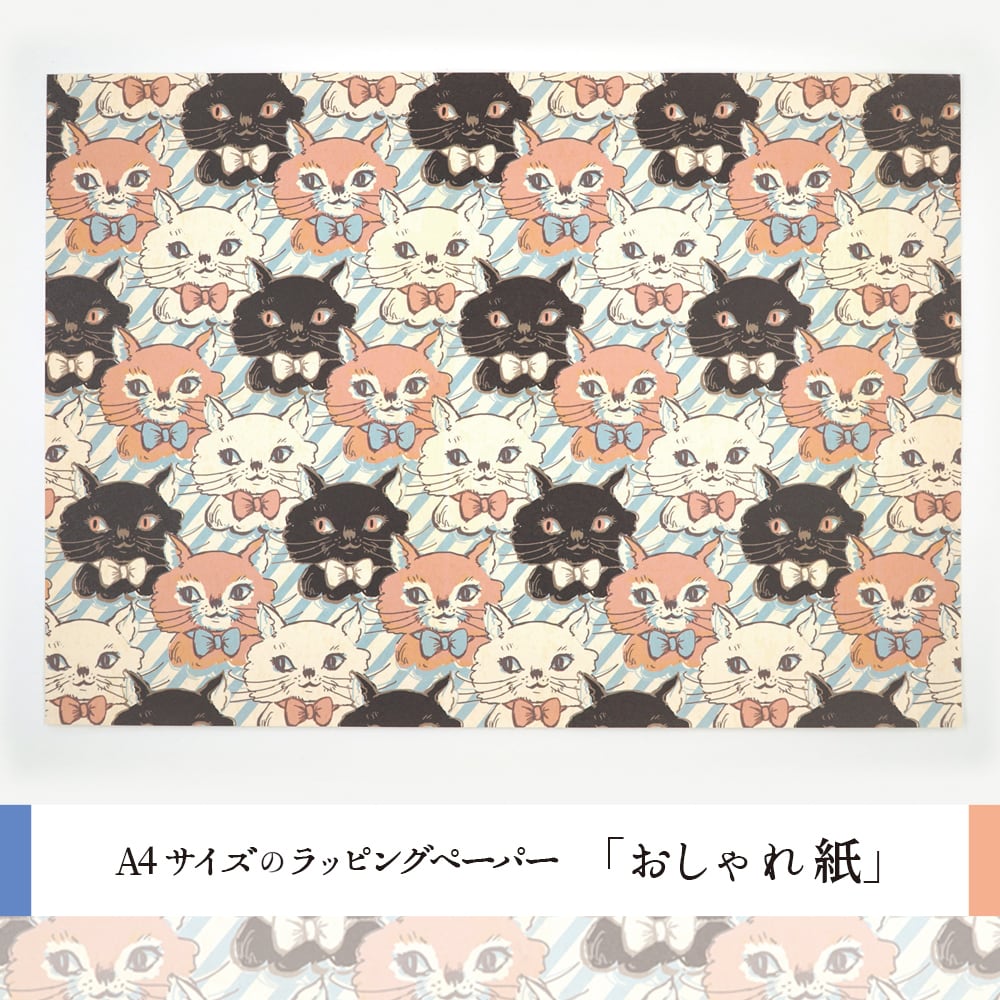 紙モノ作家『ant!ant!!ant!!!』のオリジナルイラストを使った、おリボンをつけたおすましねこちゃんの包装紙。