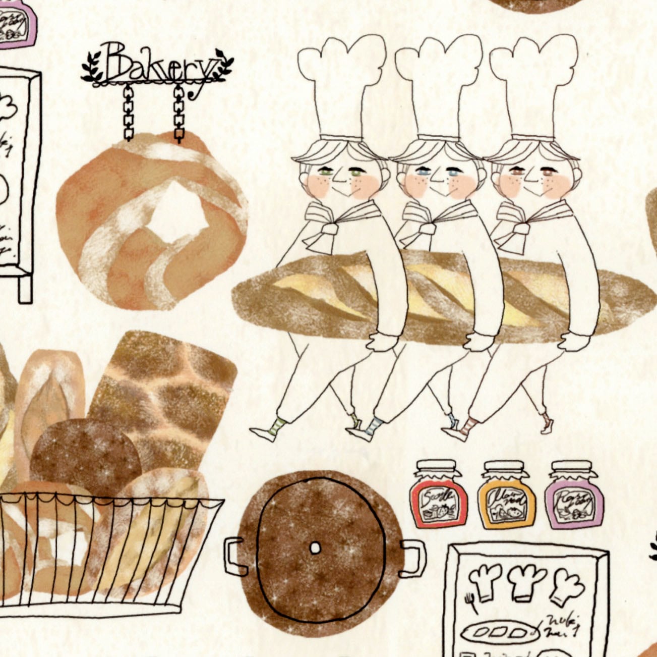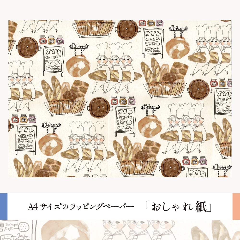 紙モノ作家『ant!ant!!ant!!!』のオリジナルイラストを使った、3つ子のパン職人がつくったおいしそうなパンの包装紙。