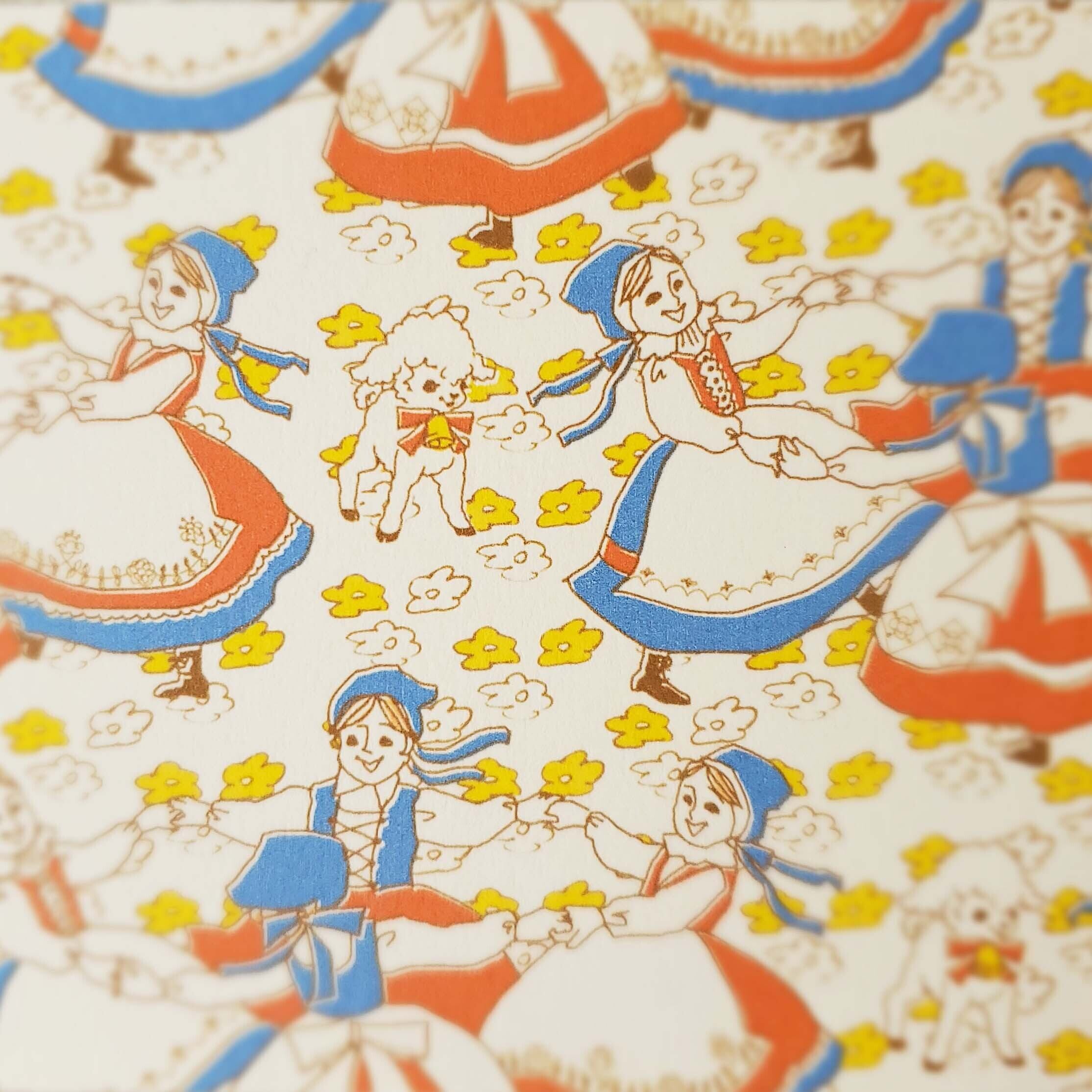 草原で踊っている女の子と子羊の柄のポストカードです。