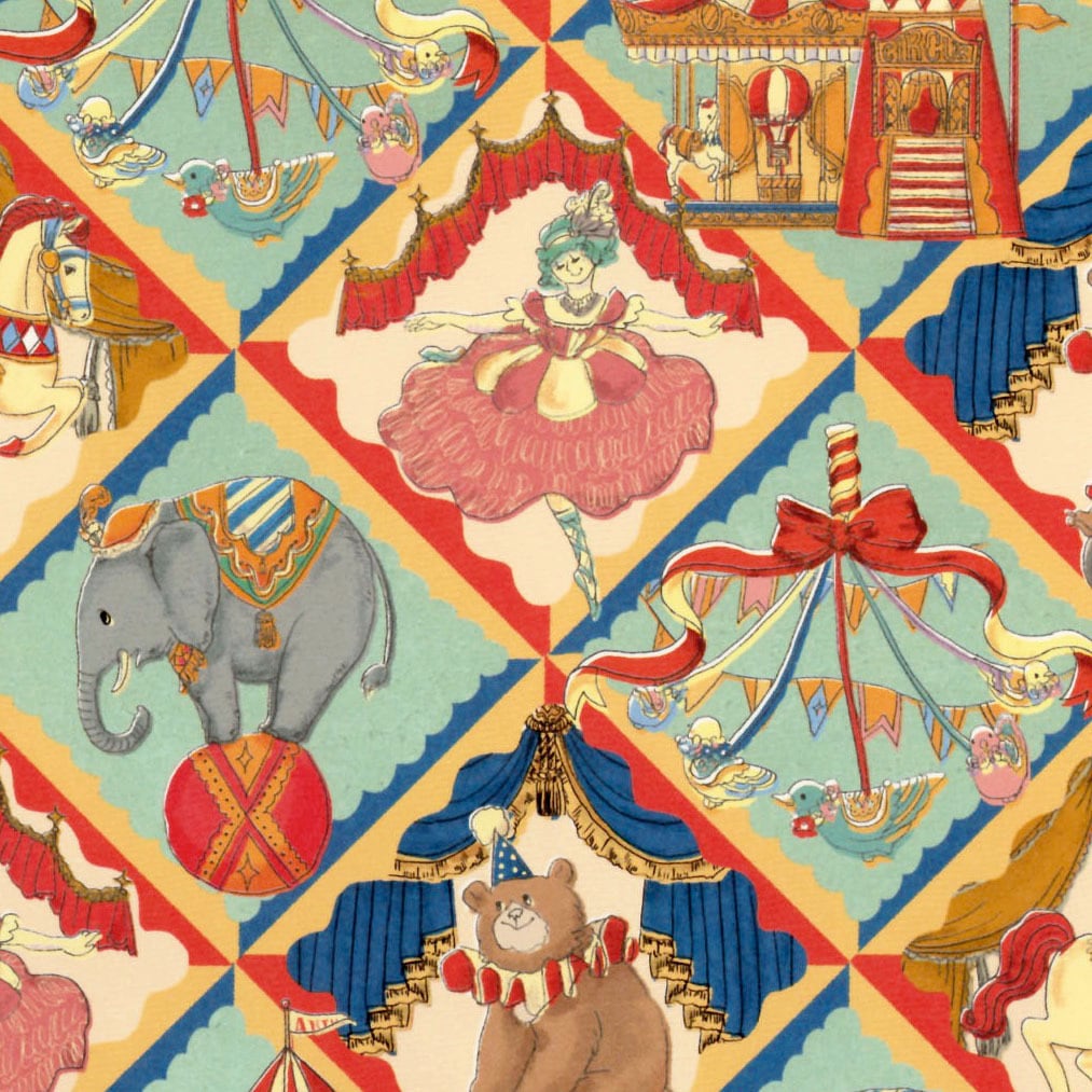 にぎやかなサーカス団と移動遊園地の包装紙。